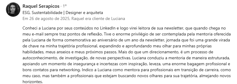 No mês de junho de 2025, foi aniversário de um ano da Reflexo, minha newsletter no Substack, e para celebrar essa conquista abri uma sessão gratuita de mentoria para um profissional em transição de carreira.